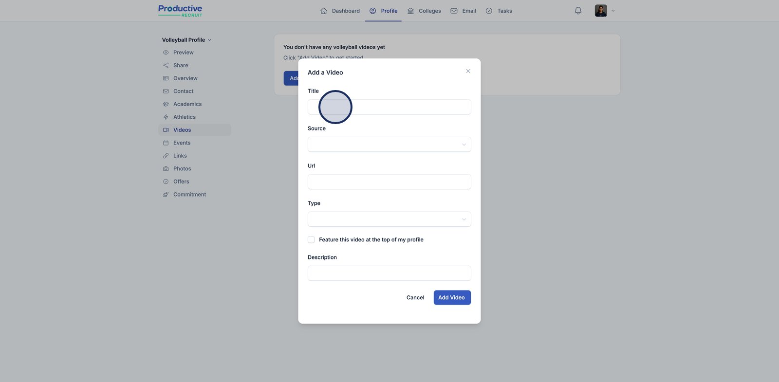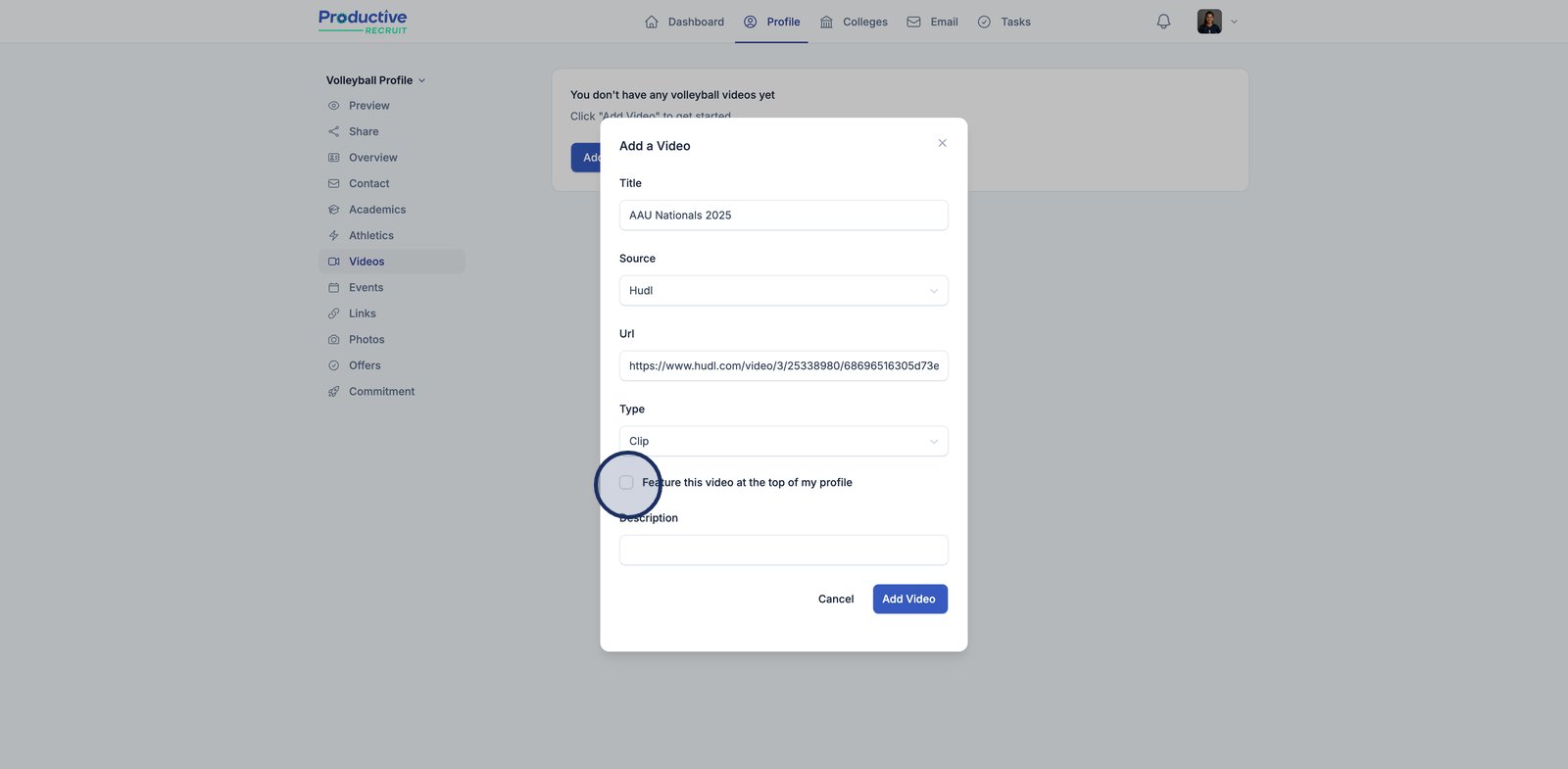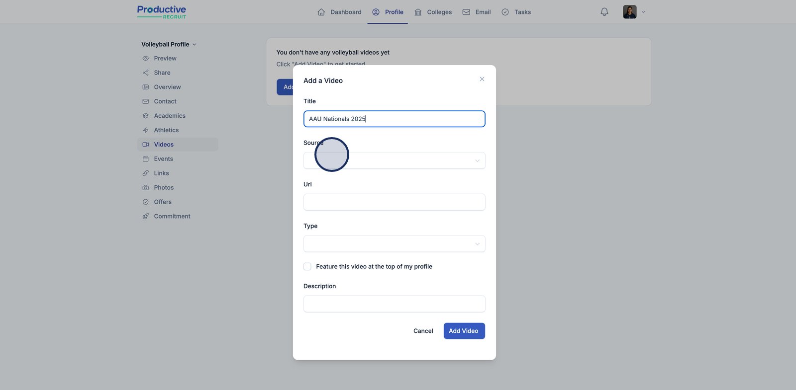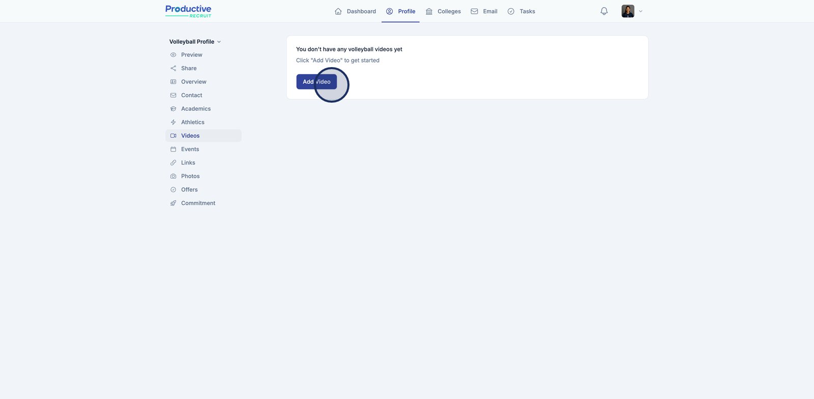1. Begin adding a video by clicking the Add Video button in your profile's Videos section.