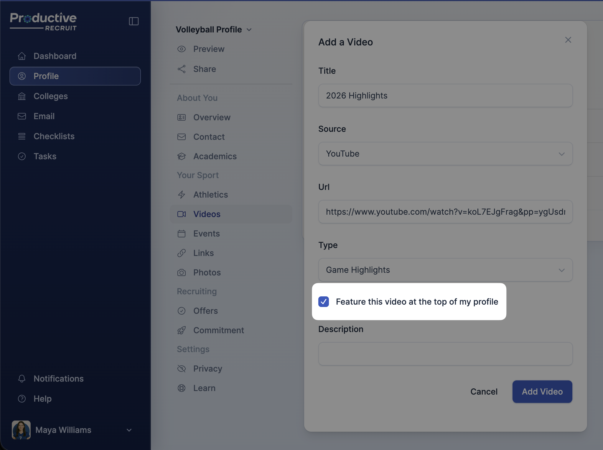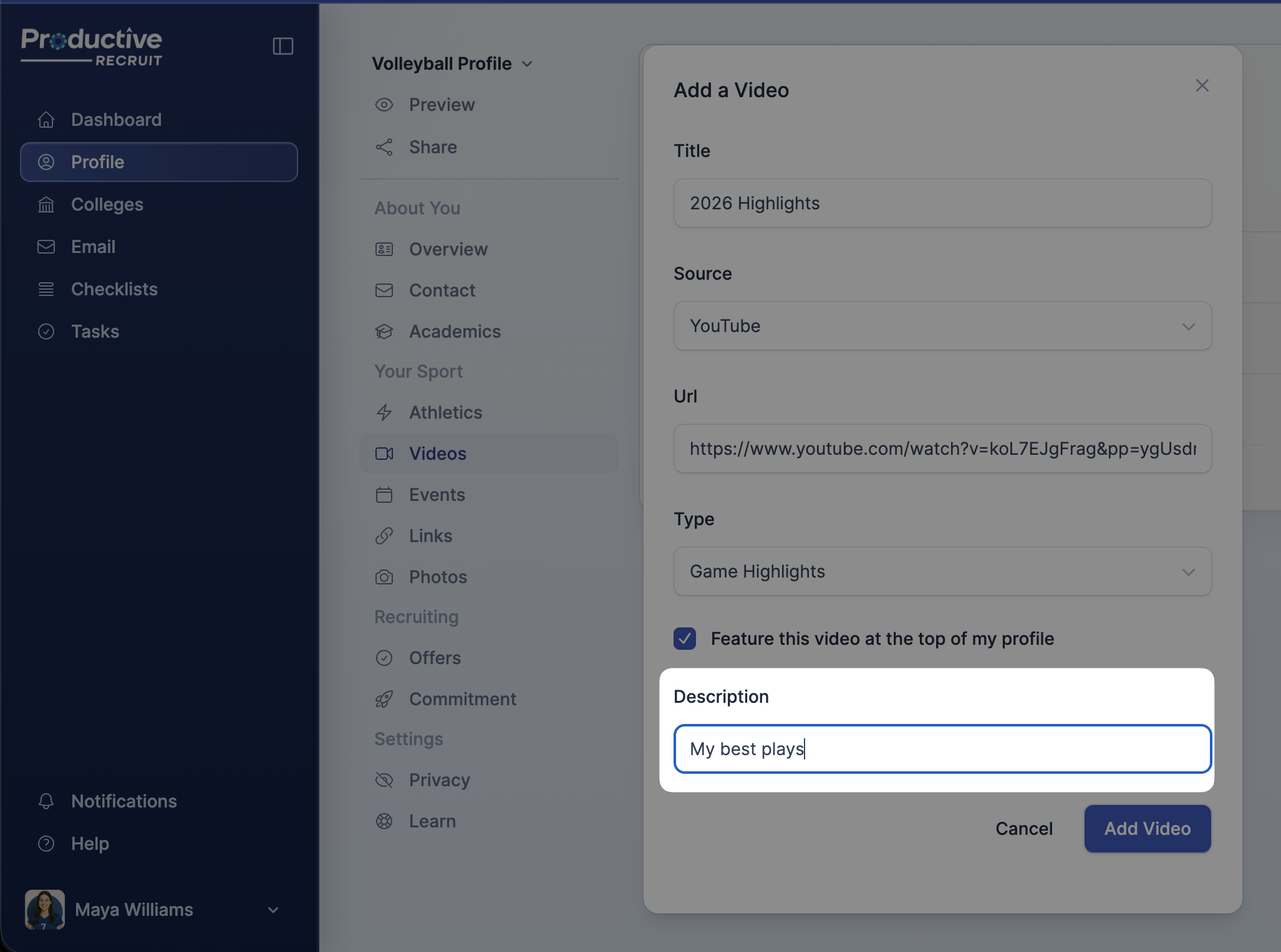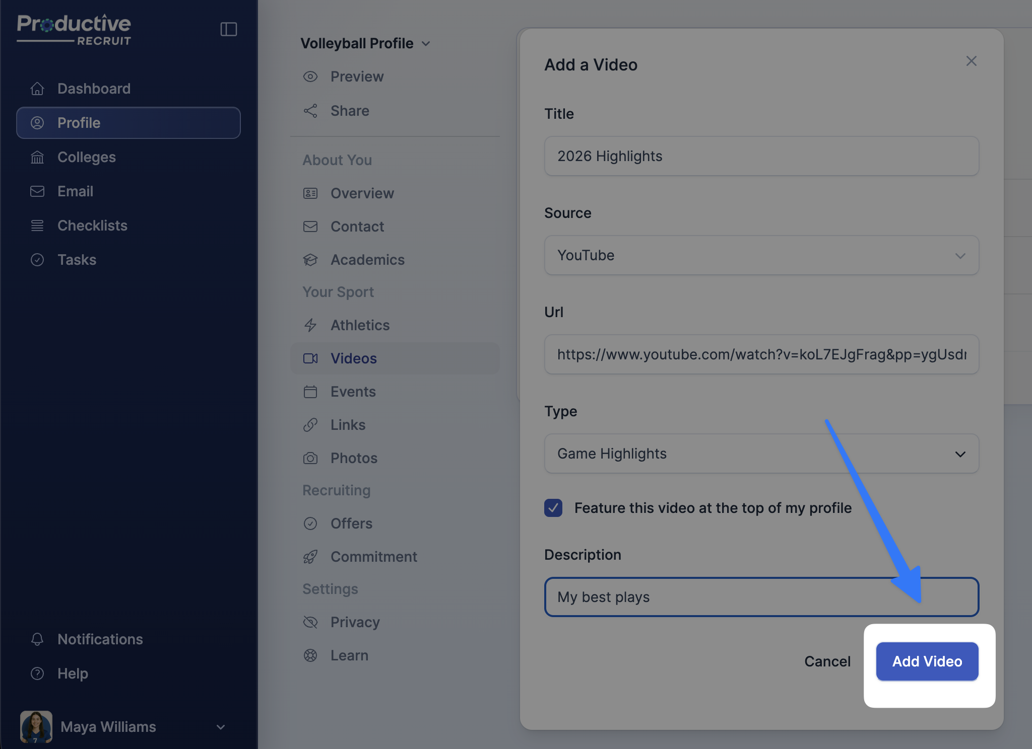 8. Finish by clicking Add Video to upload your video to your profile.
