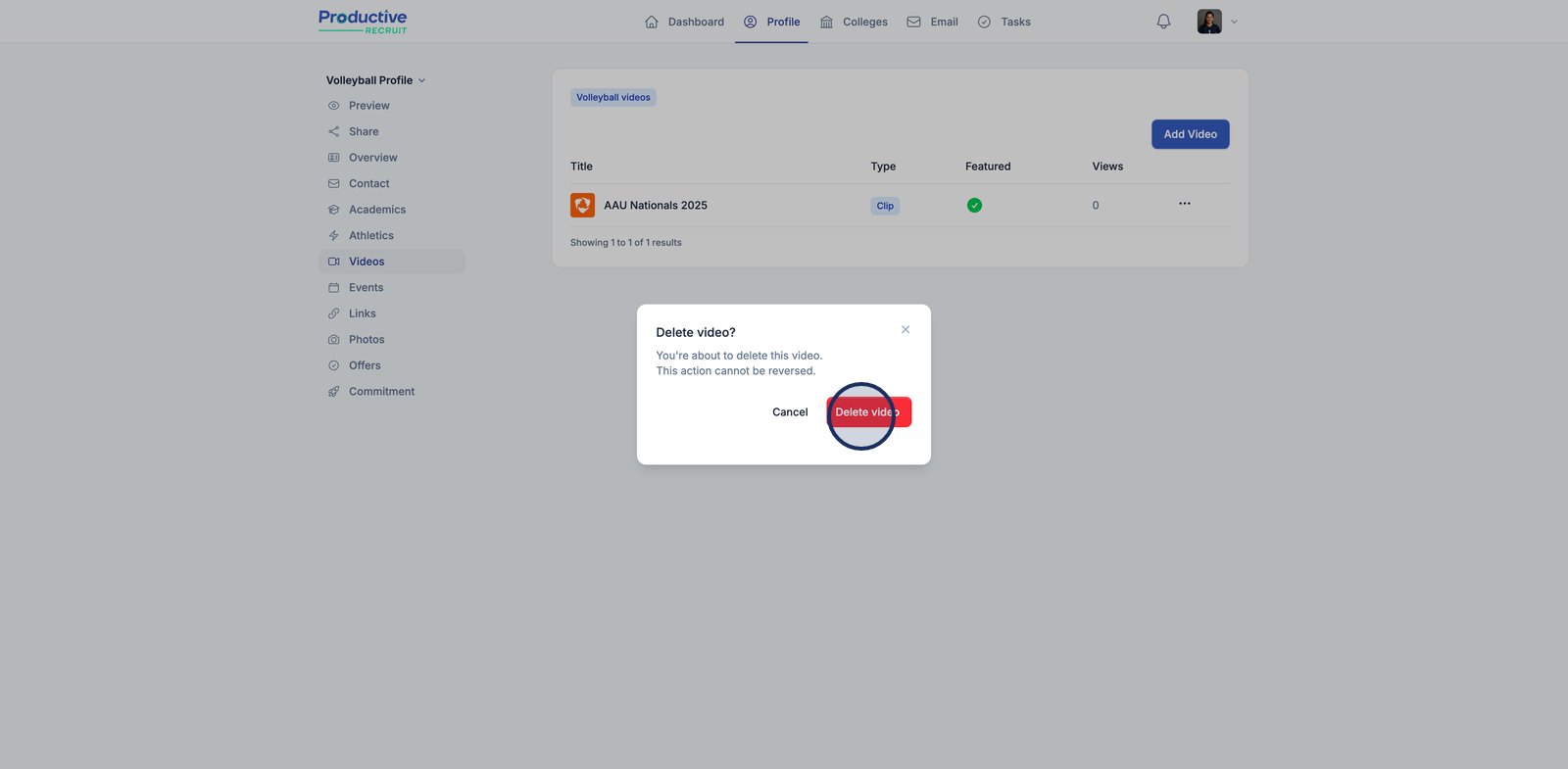 3. Confirm by clicking Delete video in the dialog to permanently remove this video from your profile.