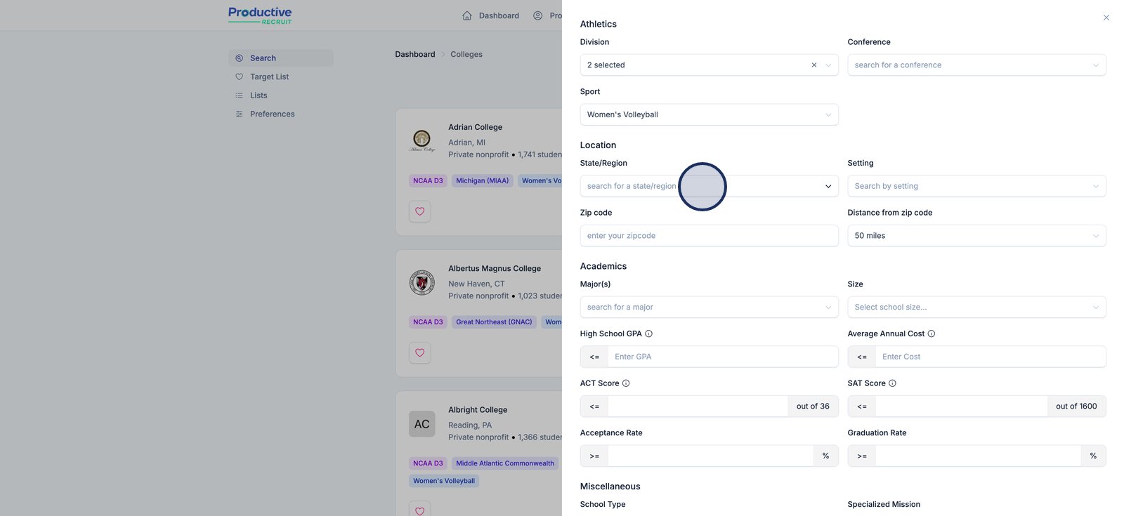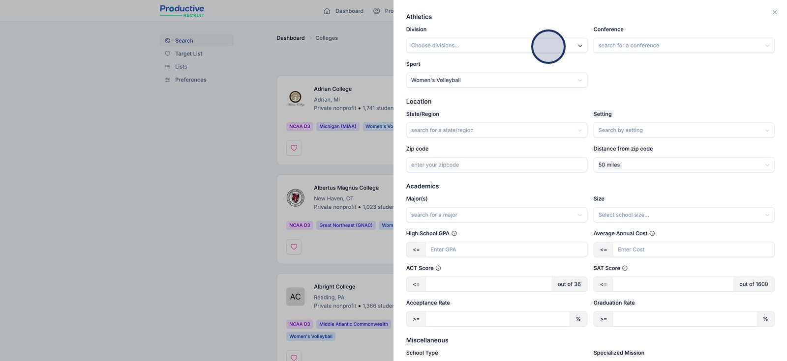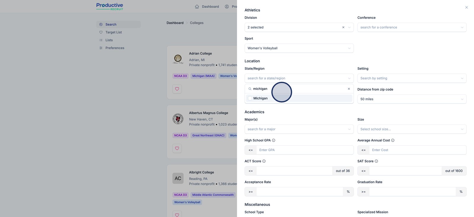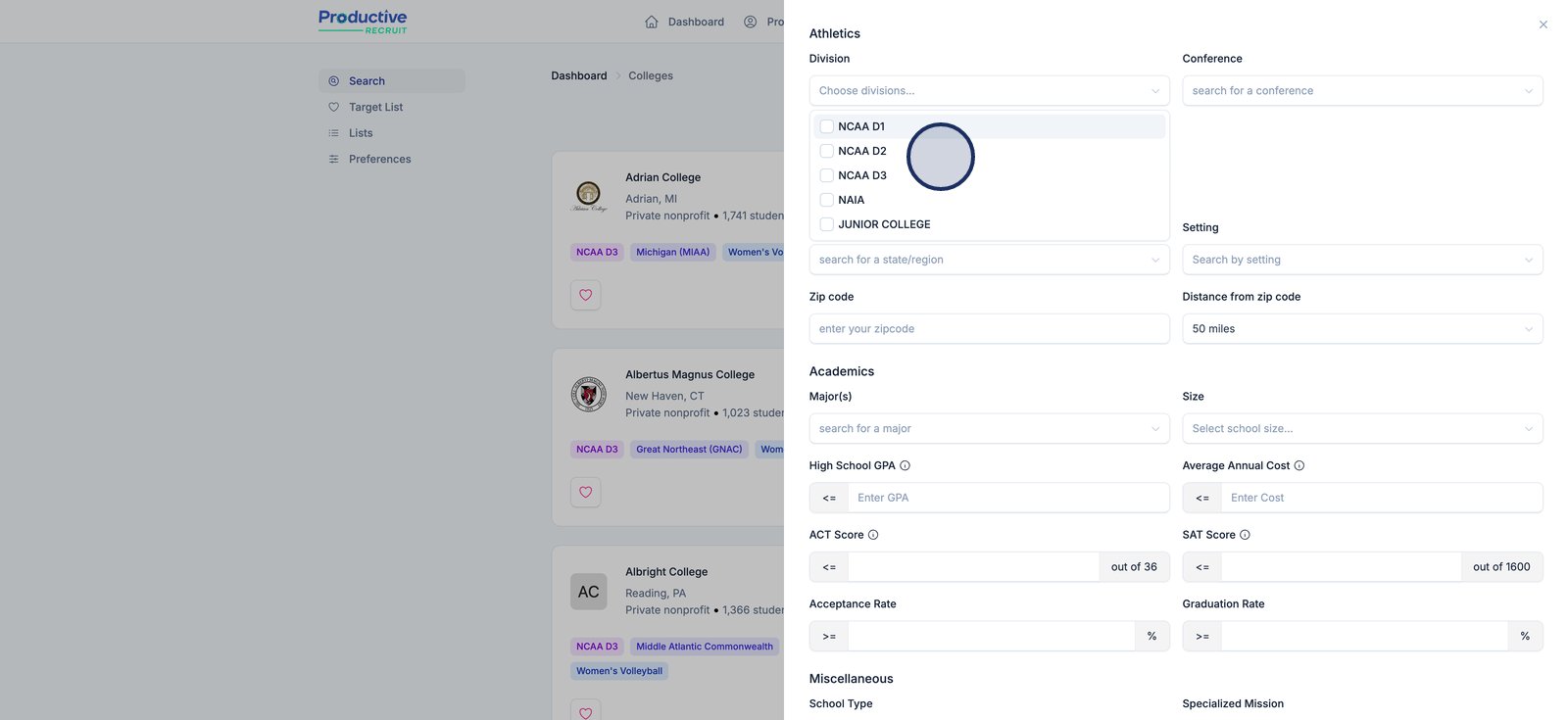 - For dropdowns like conferences, majors, and states, only the first 20 options are shown by default. Start typing to search and see more choices.