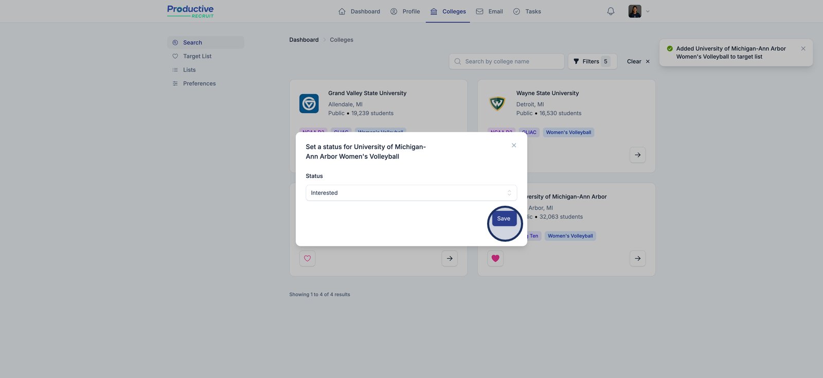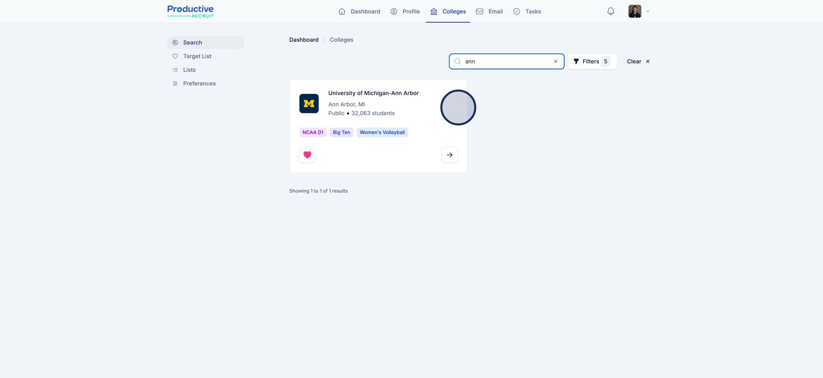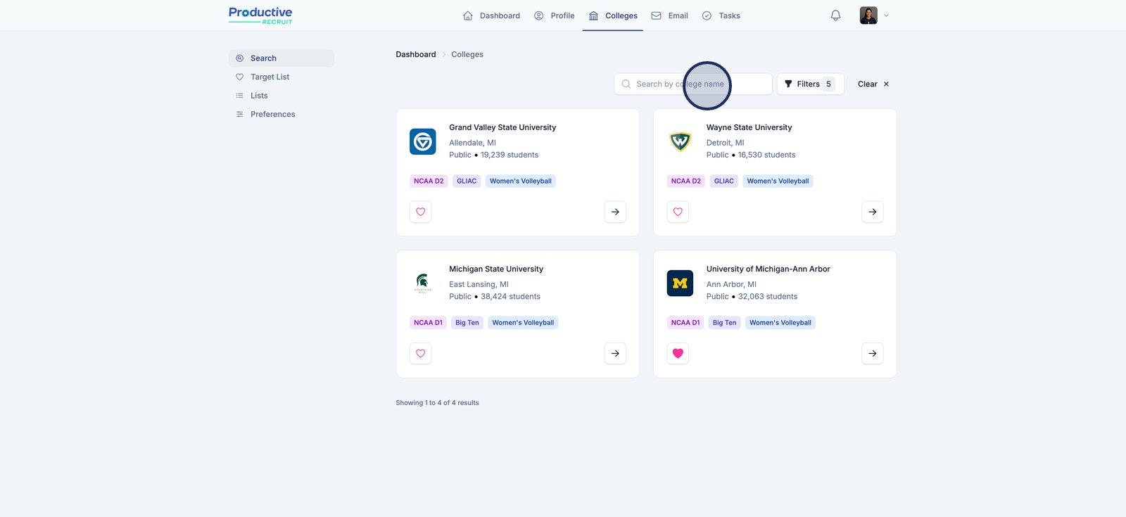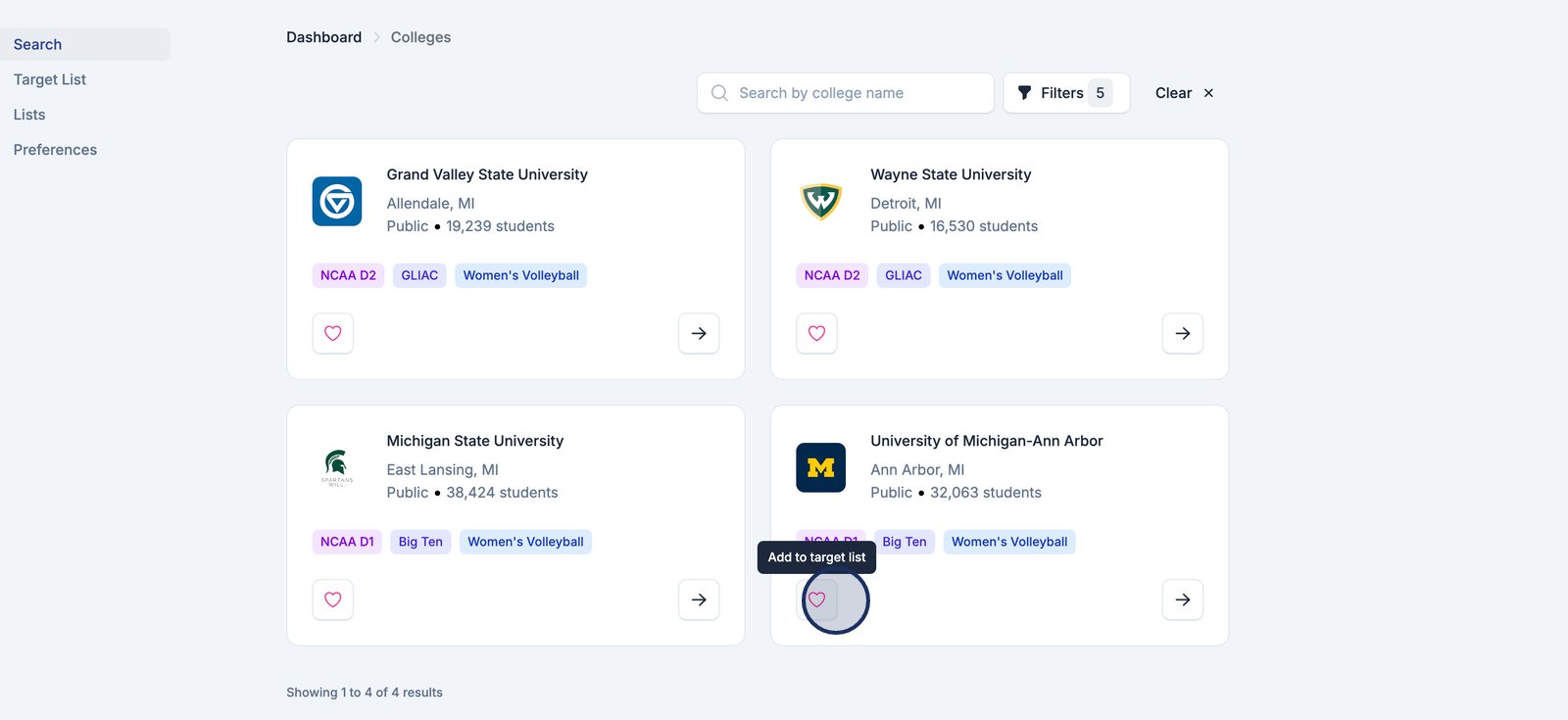 13. Now we only see 4 results! Click the heart icon to add this college to your target list for easy access later.