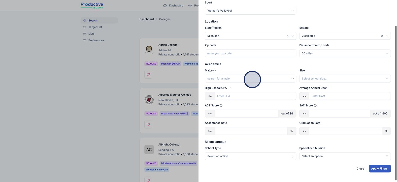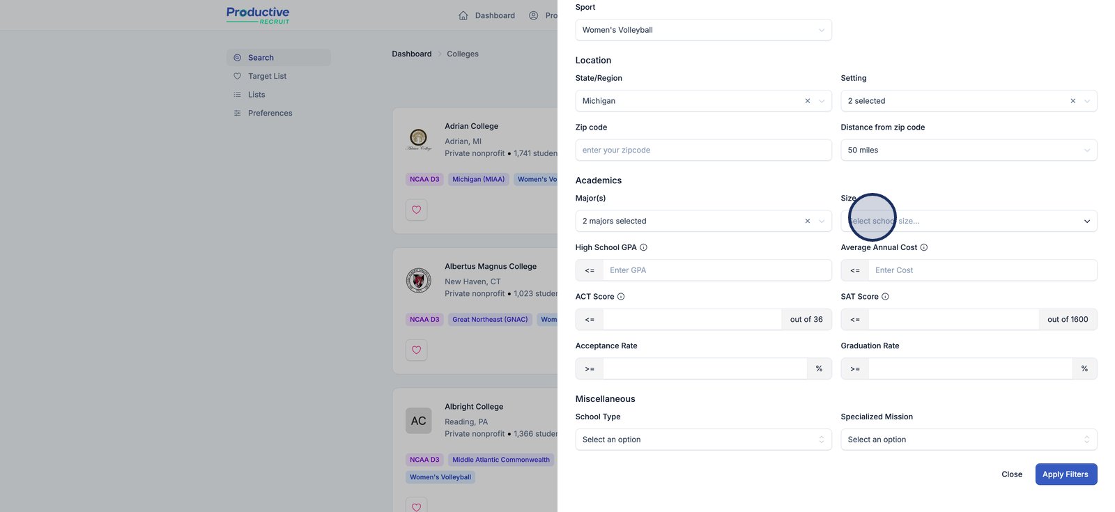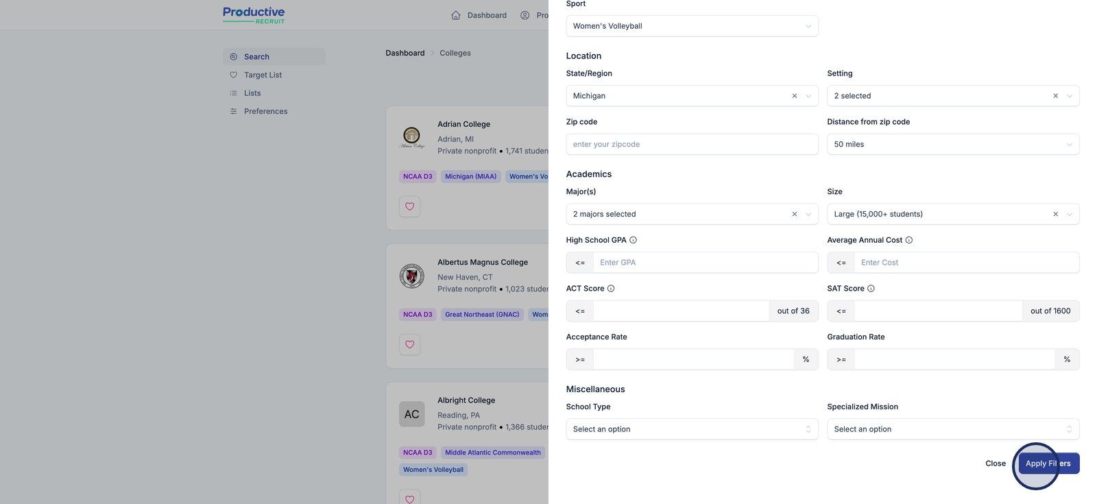 12. Click Apply Filters to update the college list based on your selected criteria.