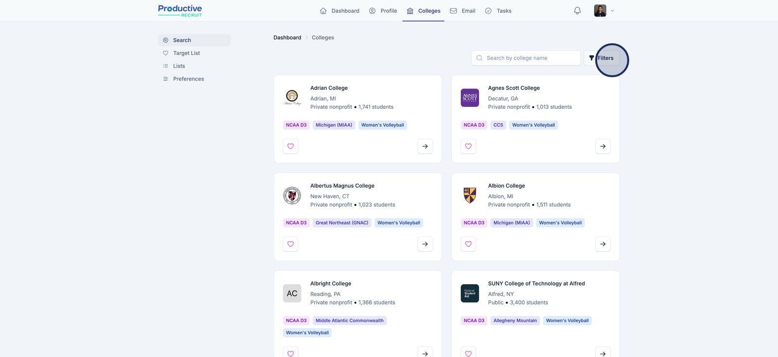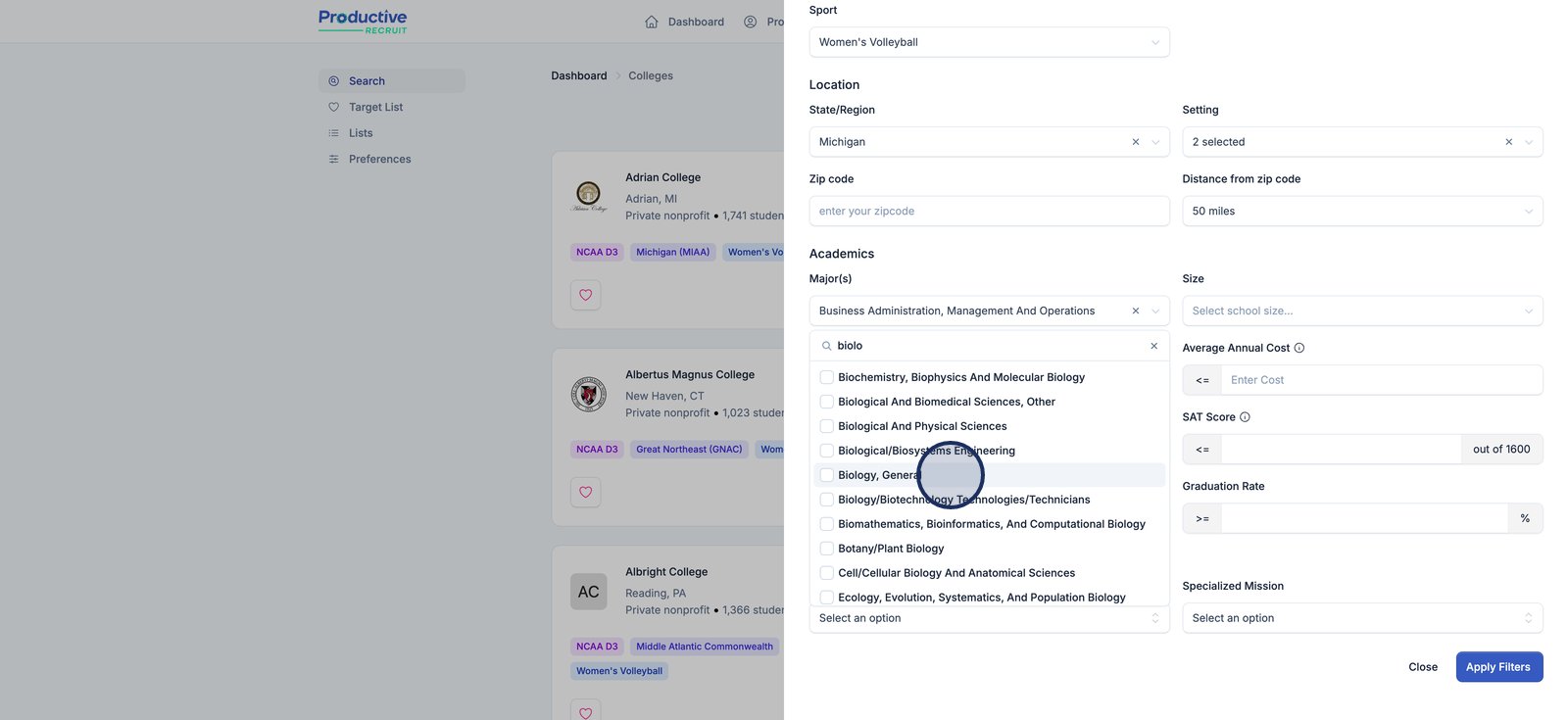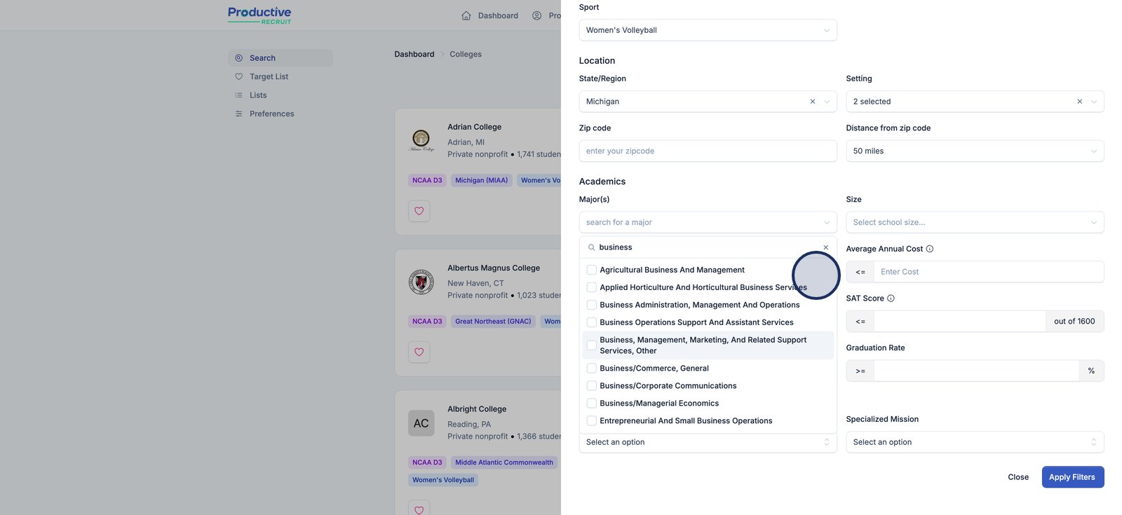 12. Click Apply Filters to update the college list based on your selected criteria.