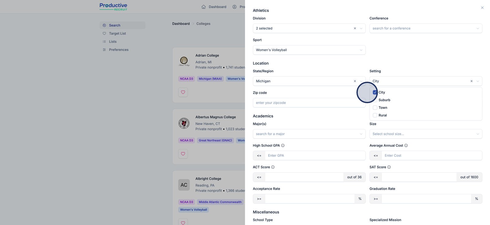 - Filter colleges by their campus setting—choose from city, suburb, town, or rural—based on the type of environment you’d prefer.