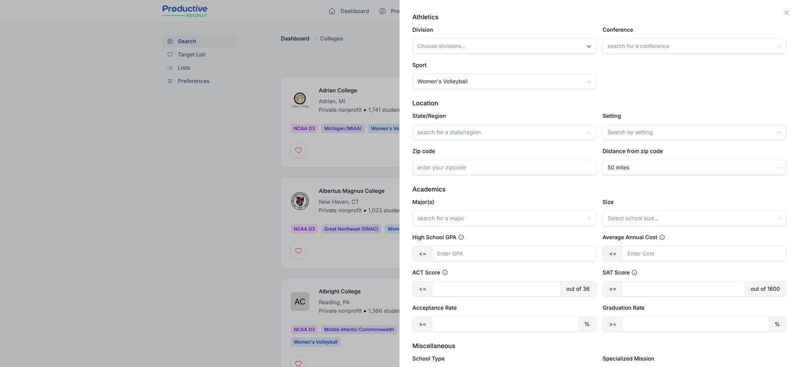 - Athletes: If you have more than one profile, use this filter to choose which sport to search for. Otherwise, we’ll automatically show colleges that offer your sport and you will not see this option.