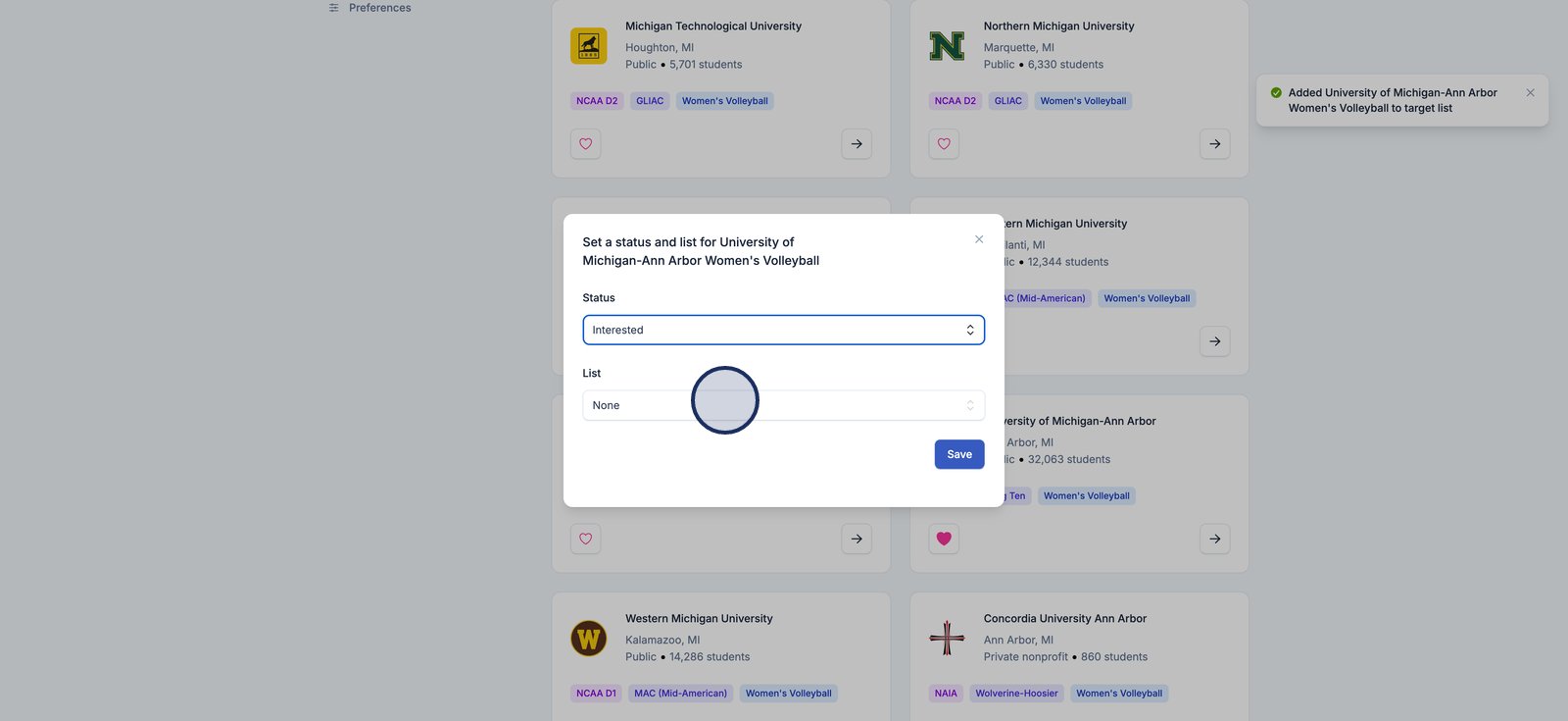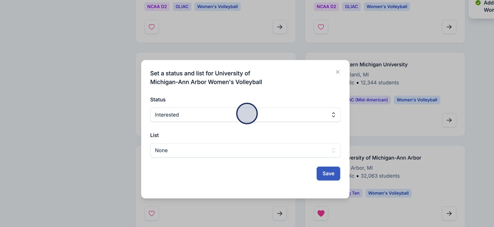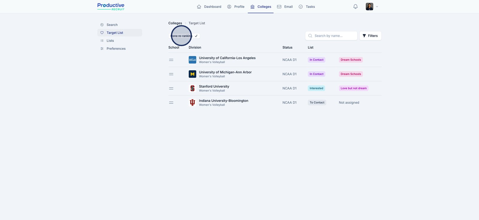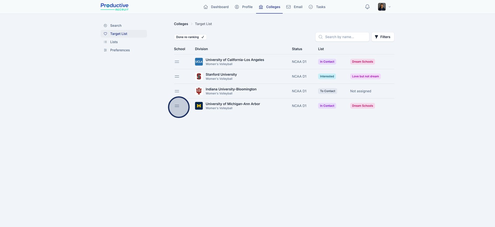 The Target List is your personal workspace for organizing and prioritizing the college programs you're actively pursuing. This tool helps you keep track of where you stand with each school, what actions you’ve taken, and how each program aligns with your recruiting goals. Whether you’re just starting outreach or deep in conversations, the Target List gives you a centralized place to stay organized and make strategic decisions.