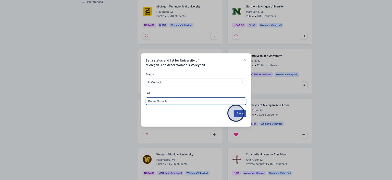 Custom lists let you tag schools on your target list for better organization. Think of them like folders or categories you create to group schools based on your own preferences or recruiting strategy. For example, you might create lists like “Dream Schools,” “High Academic,” or “West Coast Programs.”