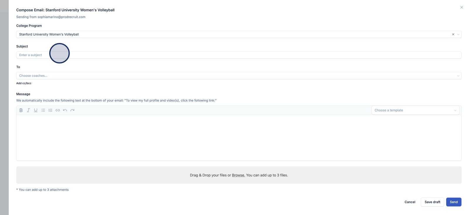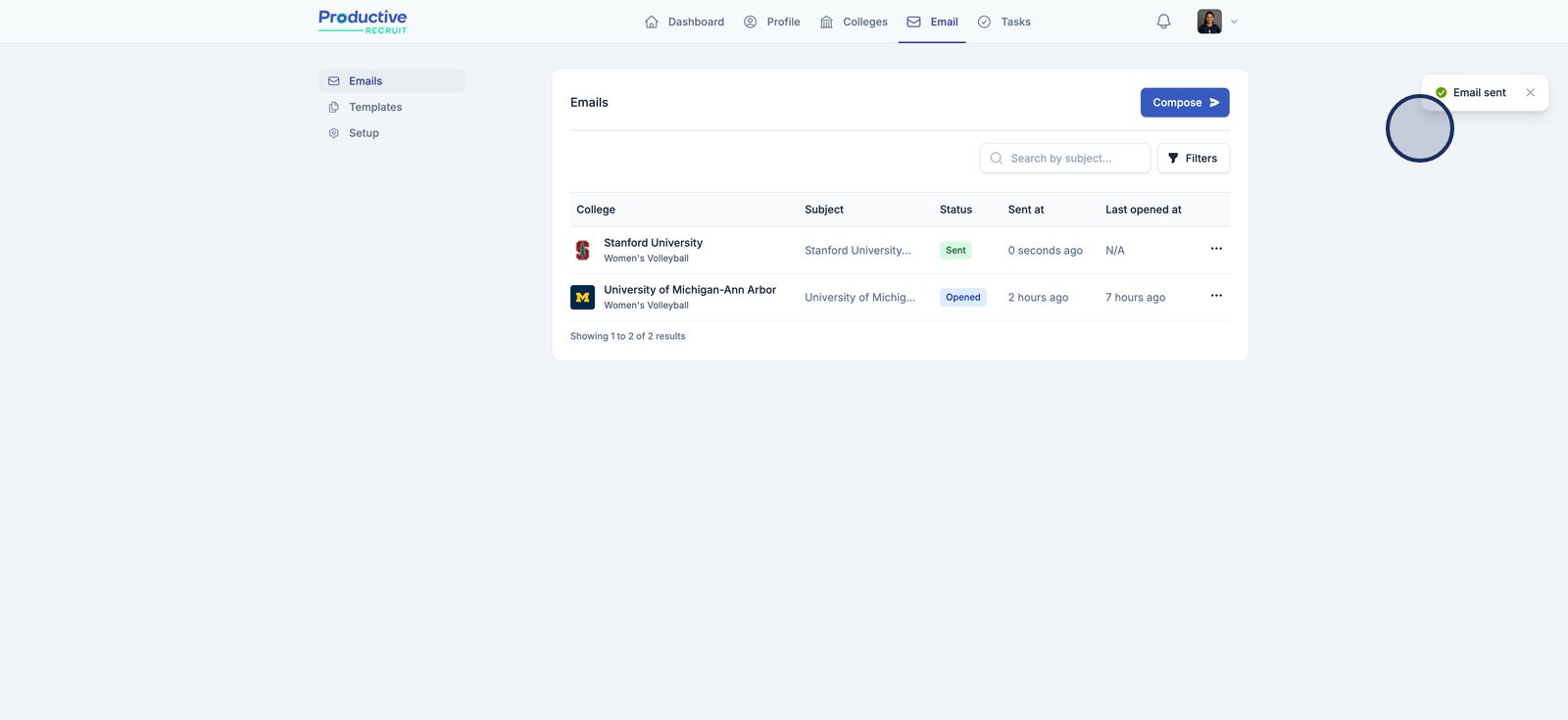 One of the most important parts of the recruiting process is outreach—and ProductiveRecruit makes it easy to stay organized and consistent with your emails. Whether you're sending your first message or following up with a program, you can email college coaches directly from the main "Emails" tab or from the "Emails" tab on any college profile.