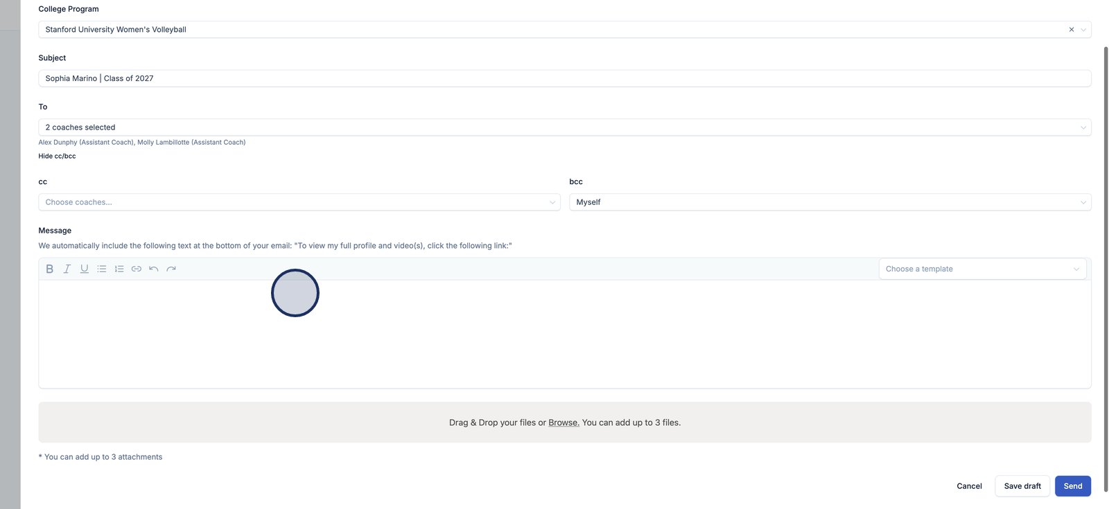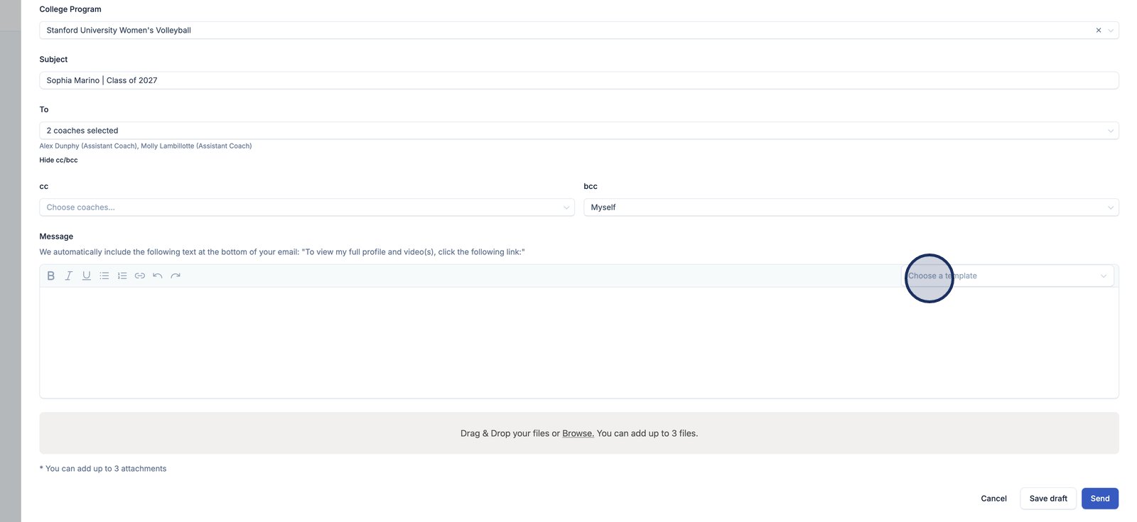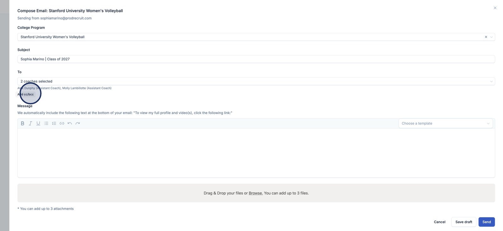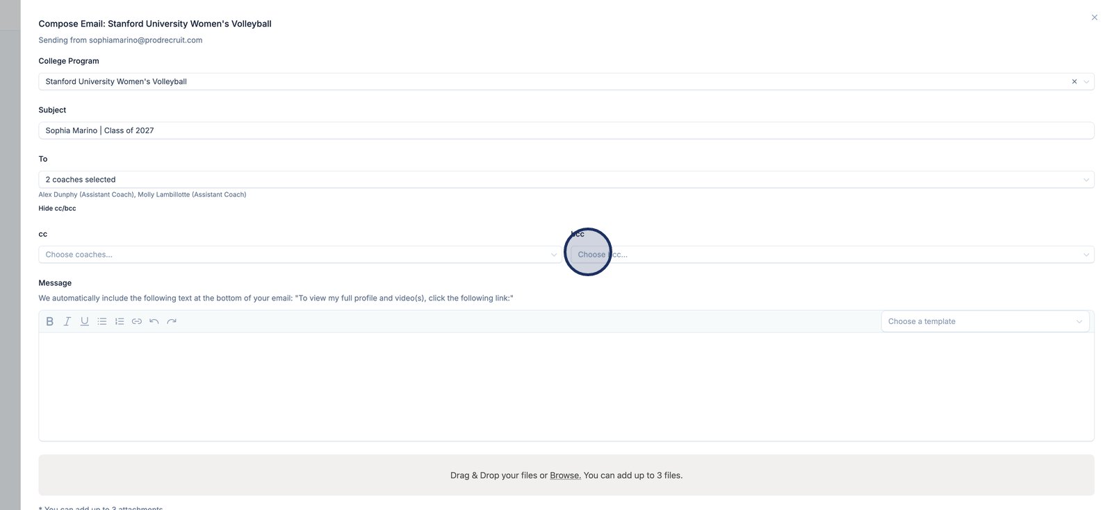 7. Add optional bcc recipients if you need to copy others discreetly.You will be able to choose "myself" or a coach if you are signed up with a club or recruiter.